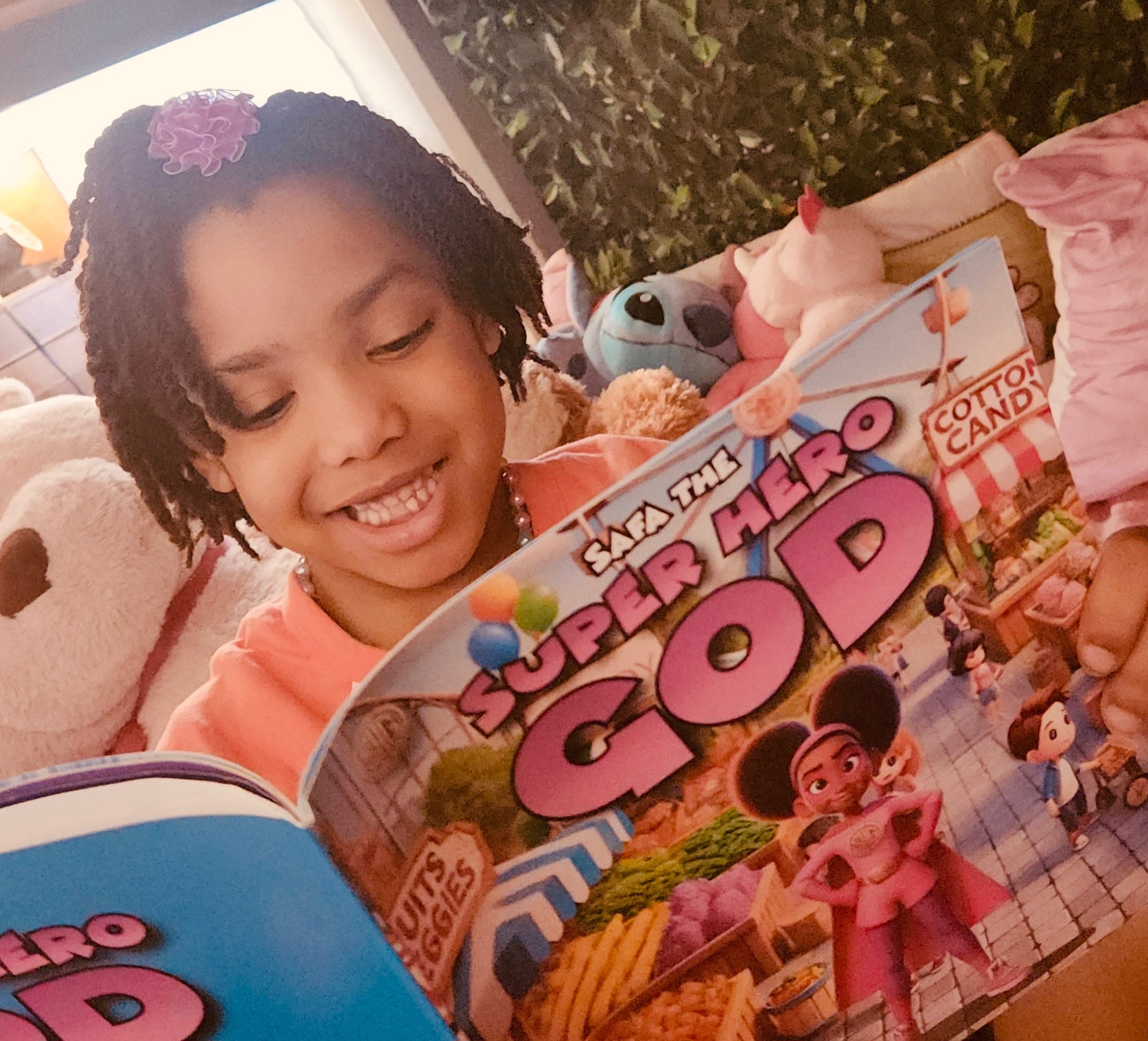 "What I love most about this character is that anyone can be a superhero like Safa the Superhero God. She is simply a girl who studies how food can heal the body and goes around the world sharing that knowledge with other children. And yes! She wears a superhero costume. I mean, she is a superhero, right? This story is so child friendly that my three-year-old son and seven-year-old daughter won’t put it down."